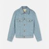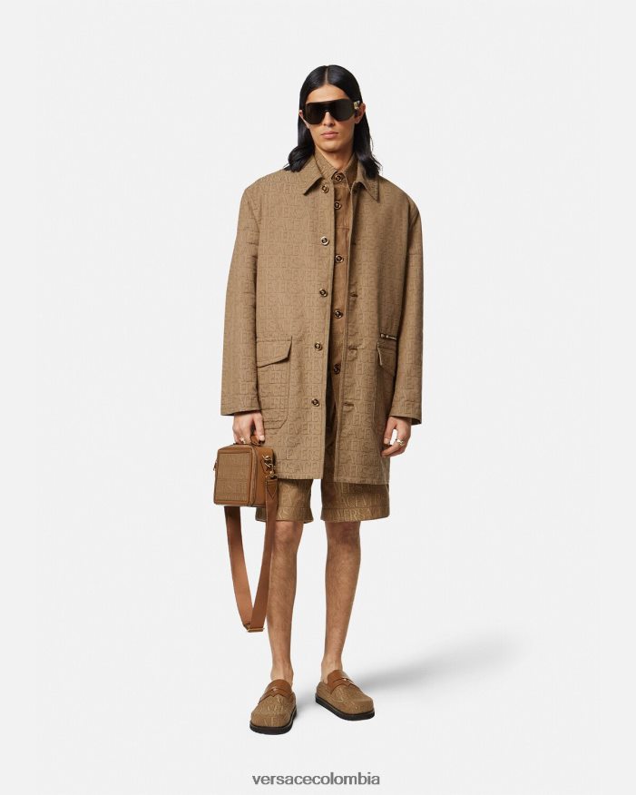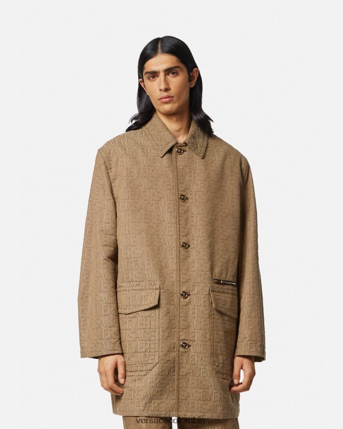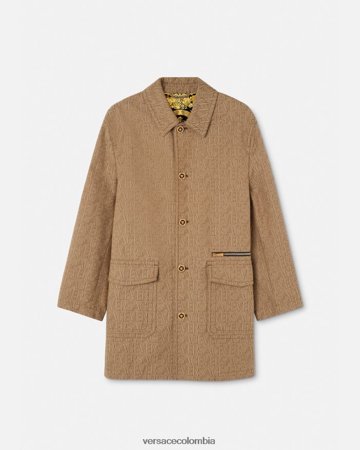 Este abrigo de lona técnica presenta un patrón de logotipo de Versace en jacquard, acentuado por piezas metálicas de medusa esmaltadas y un forro parcial de color barroco.