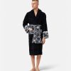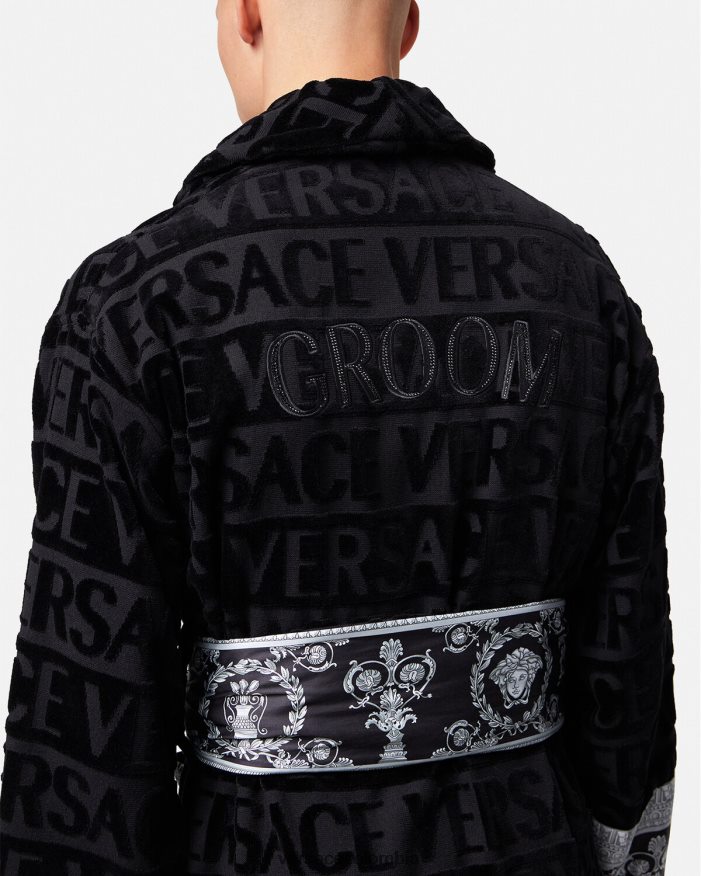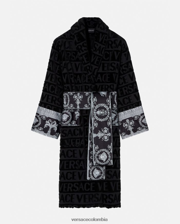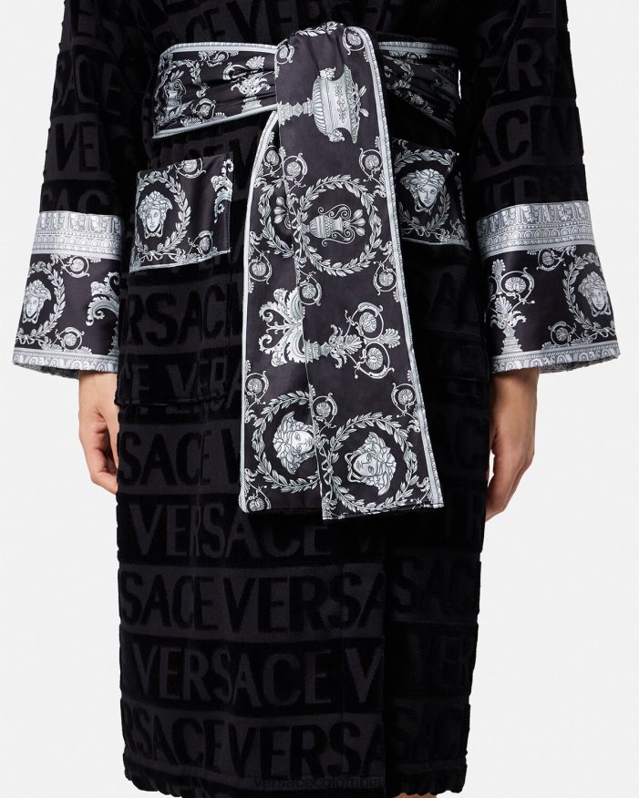 Esta bata de baño larga de algodón de rizo presenta un estampado integral de jacquard tonal de Versace. El albornoz de novio adornado con cristales se puede combinar con el albornoz de novia a juego para una ocasión especial de boda. El estilo loungewear se detalla con mangas con estampado barroco en el mismo tono y un cinturón anudado.