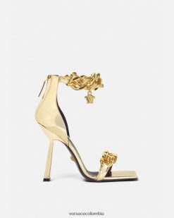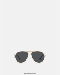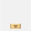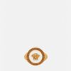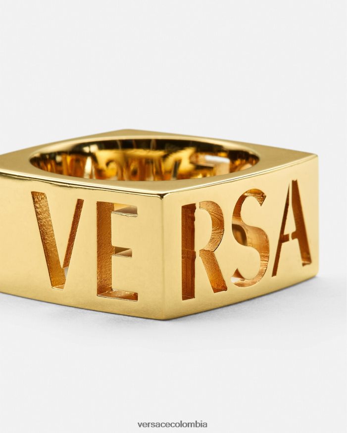 un anillo cúbico con una letra de versace grabada y una tachuela de medusa. Todos los productos de joyería de Versace no contienen plomo ni níquel. Todos los materiales son hipoalergénicos.