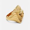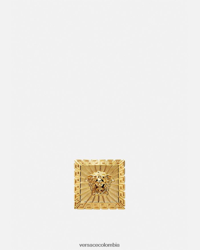 un atrevido anillo con una cabeza de medusa cuadrada, acabado en oro versace. Ninguno de los productos de joyería de Versace contiene plomo ni níquel. Todos los materiales son hipoalergénicos.