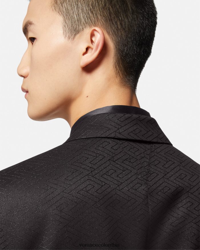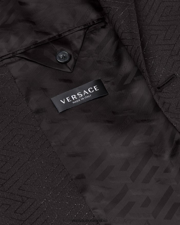 Este blazer de noche de botonadura sencilla presenta un estampado integral de La Greca en jacquard de lúrex metalizado. El estilo ajustado tiene cuello con muesca y bolsillos ribeteados.