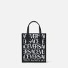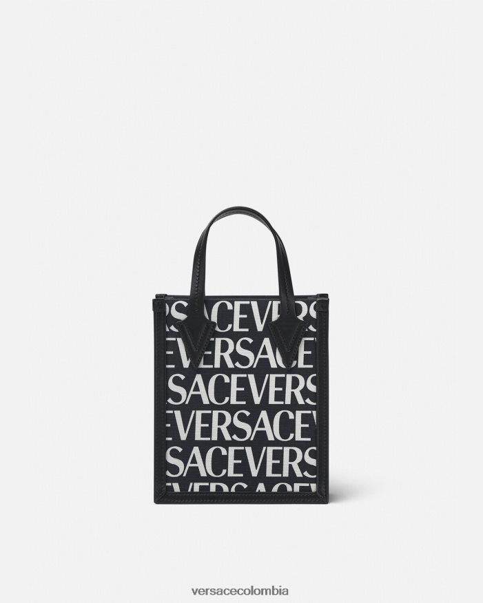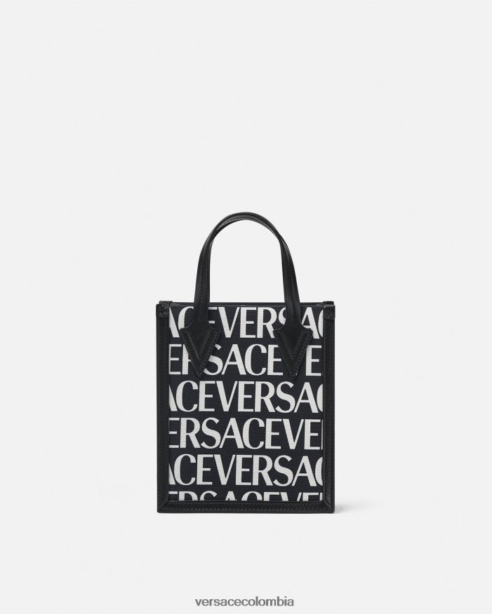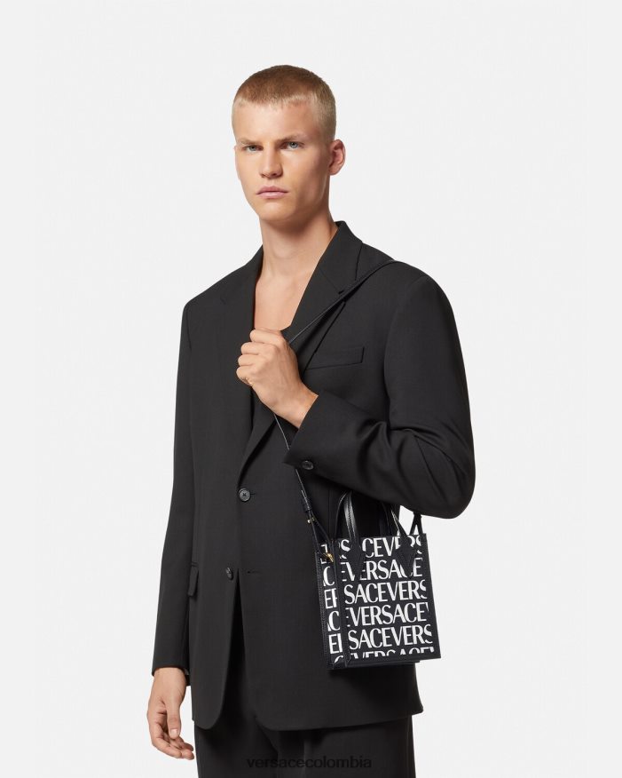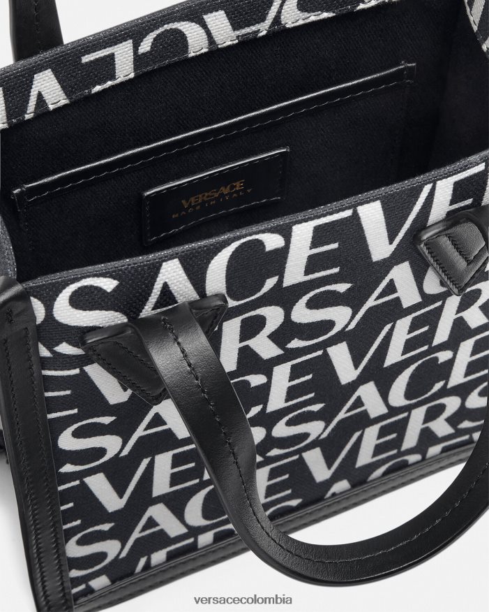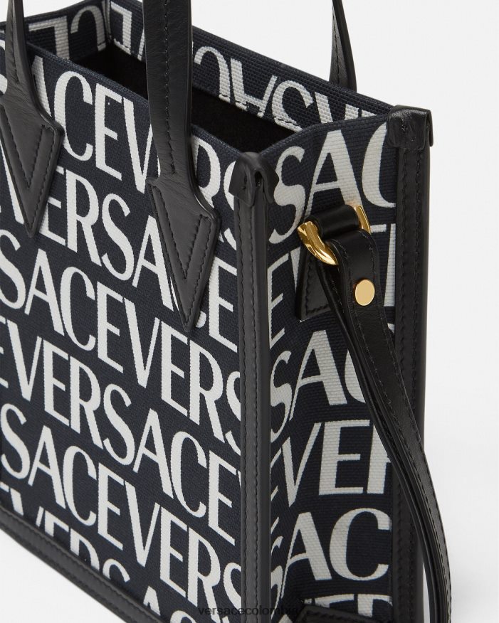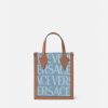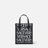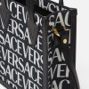 un pequeño bolso bandolera confeccionado en lona con el logo de versace estampado por toda la prenda. El estilo abierto está rematado con asas superiores y una correa para el hombro ajustable.
