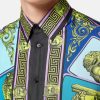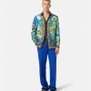Confeccionada en sarga de seda con un corte regular y fluido, esta camisa de manga larga tiene cierre frontal con botones, cuello puntiagudo y el estampado le maschere, una referencia clásica al teatro y la ópera en colores gráficos pop.