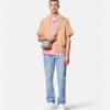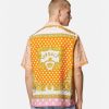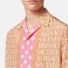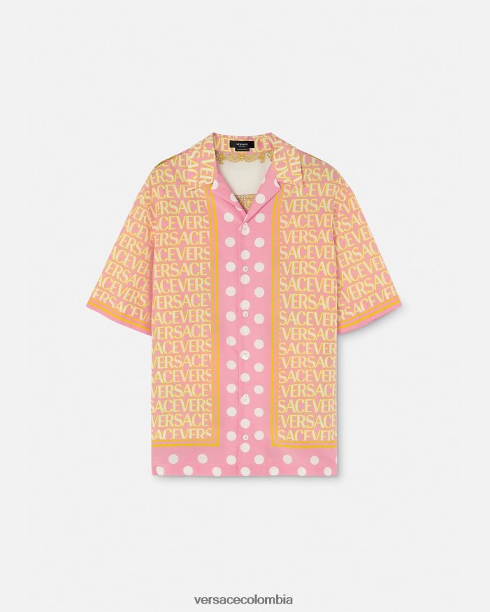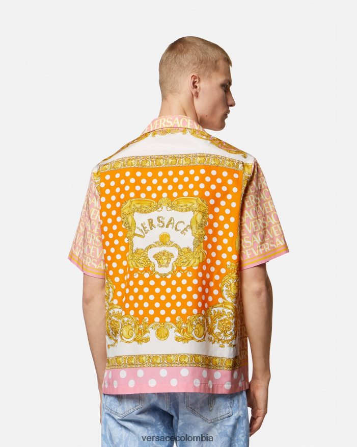 una camisa de manga corta con botones en popelina de algodón y mezcla de seda que presenta el estampado de lunares de Versace en la parte delantera y un panel con estampado de lunares barrocos de conchas marinas en la parte posterior.