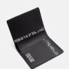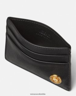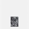 una billetera de cuero con estampado de alta costura con logotipo y múltiples ranuras interiores para tarjetas y compartimentos para billetes.