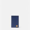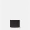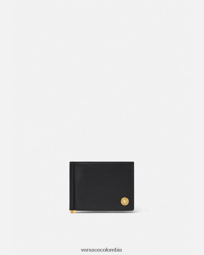 Este tarjetero plegable, confeccionado en piel de becerro flexible, presenta un adorno de Medusa Biggie. la billetera tiene seis ranuras para tarjetas internas y un clip para billetes en tono dorado.