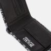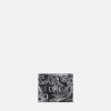 una billetera de cuero con estampado de alta costura y logotipo con múltiples ranuras para tarjetas en el interior, un monedero y compartimentos para billetes.