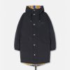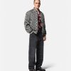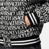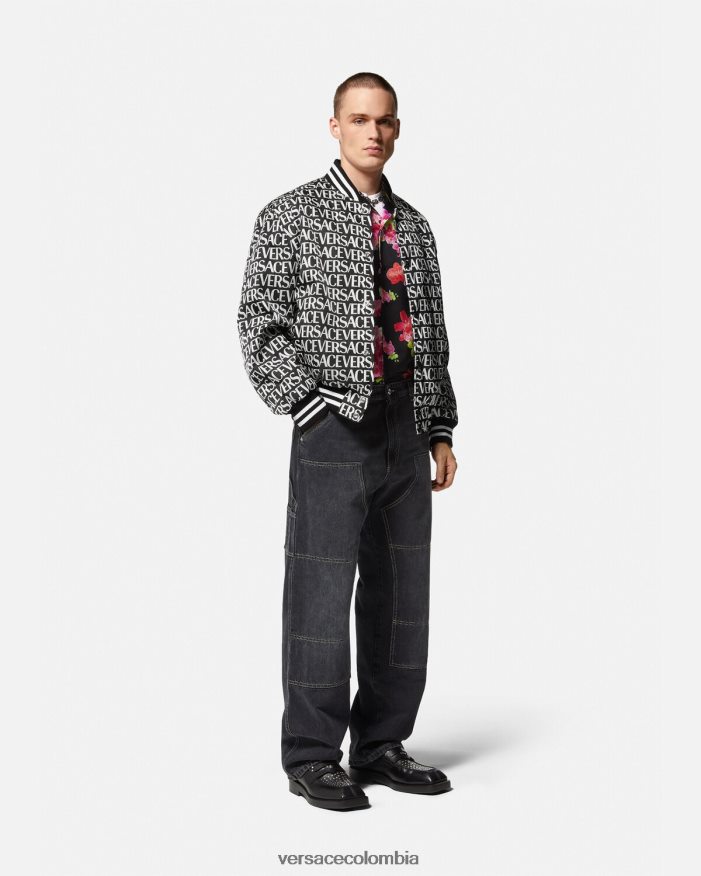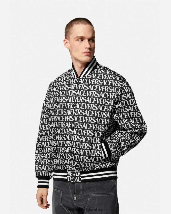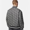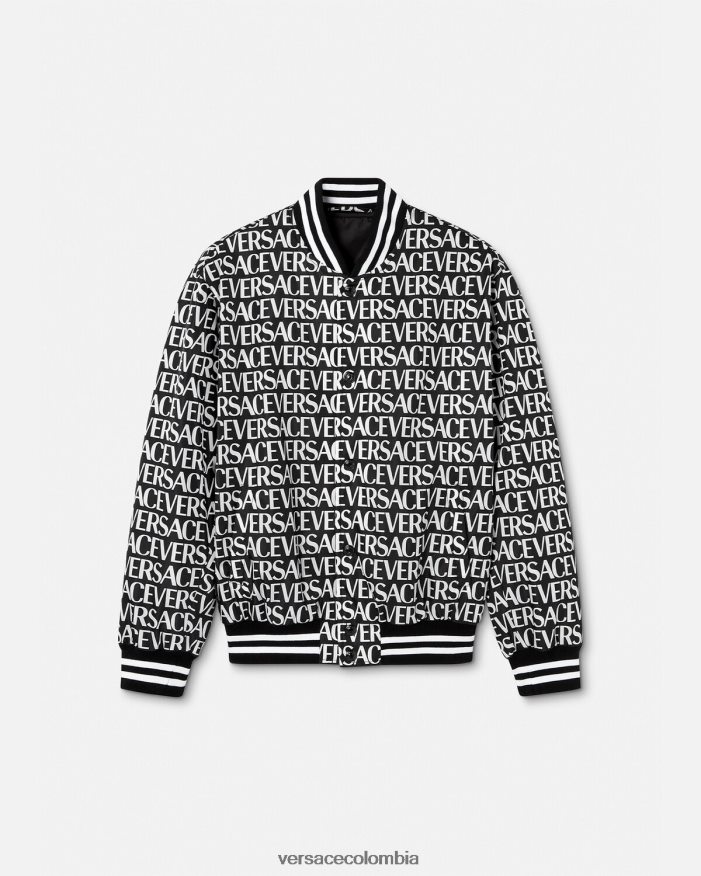 una chaqueta bomber acolchada con el logo de versace estampado en toda la prenda y ribetes acanalados a rayas.