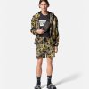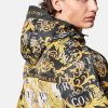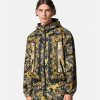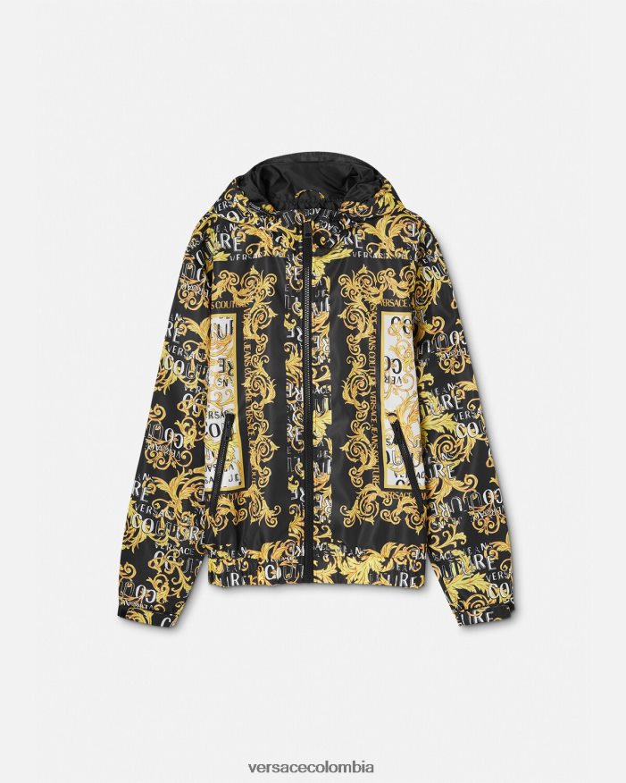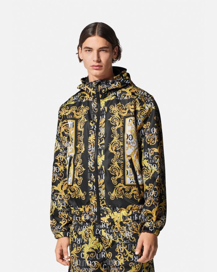 Esta chaqueta de nailon con cremallera presenta un logotipo estampado de alta costura y tiene un cierre frontal con cremallera y capucha.