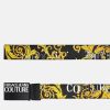 un cinturón reversible con un logotipo estampado de alta costura en un lado y una hebilla con placa giratoria y de bloqueo.