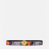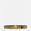 un cinturón de cuero con una hebilla de filigrana de medusa calada rodeada por el patrón de greca.