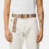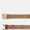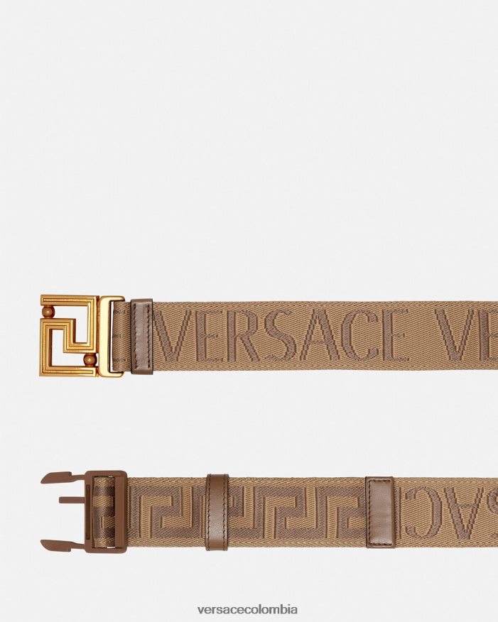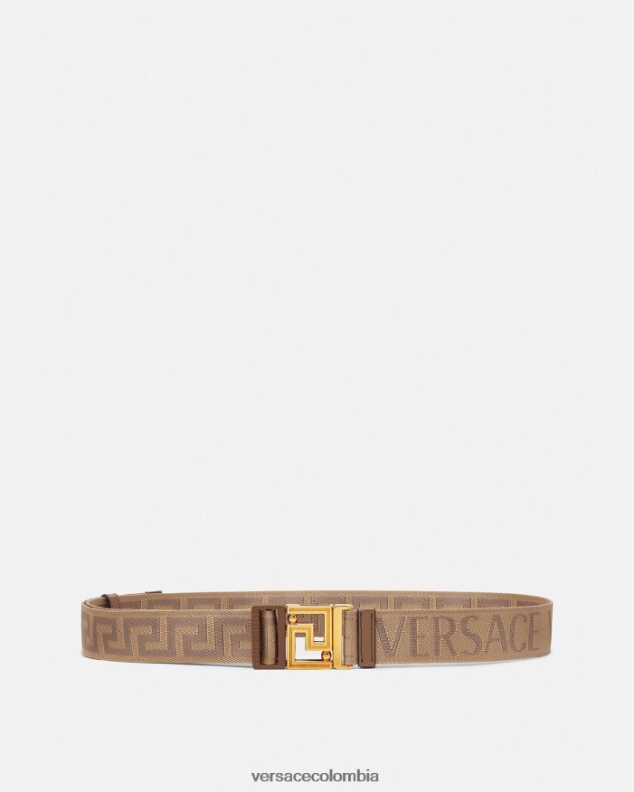 Este cinturón de tela de doble cara presenta un motivo de greca en jacquard en un lado y un estampado integral de Versace en el otro. El modelo ajustable tiene una hebilla Greca y está acabado con ribetes de cuero.