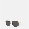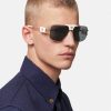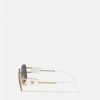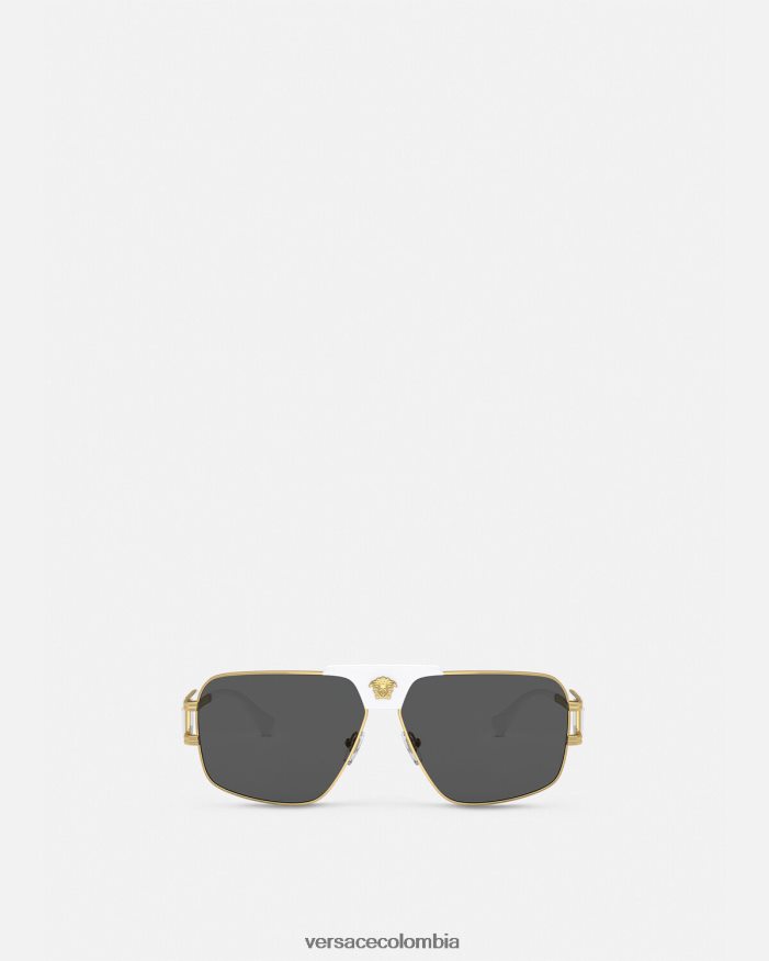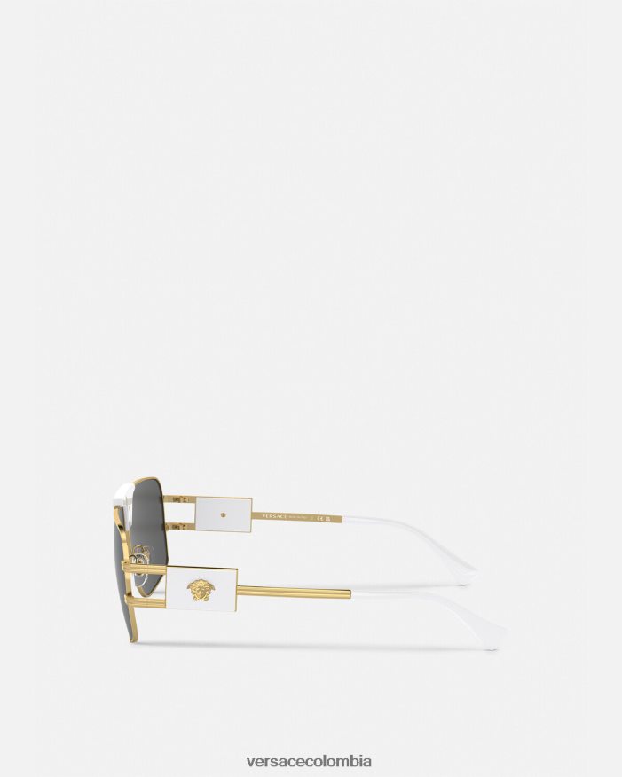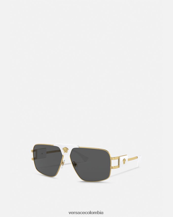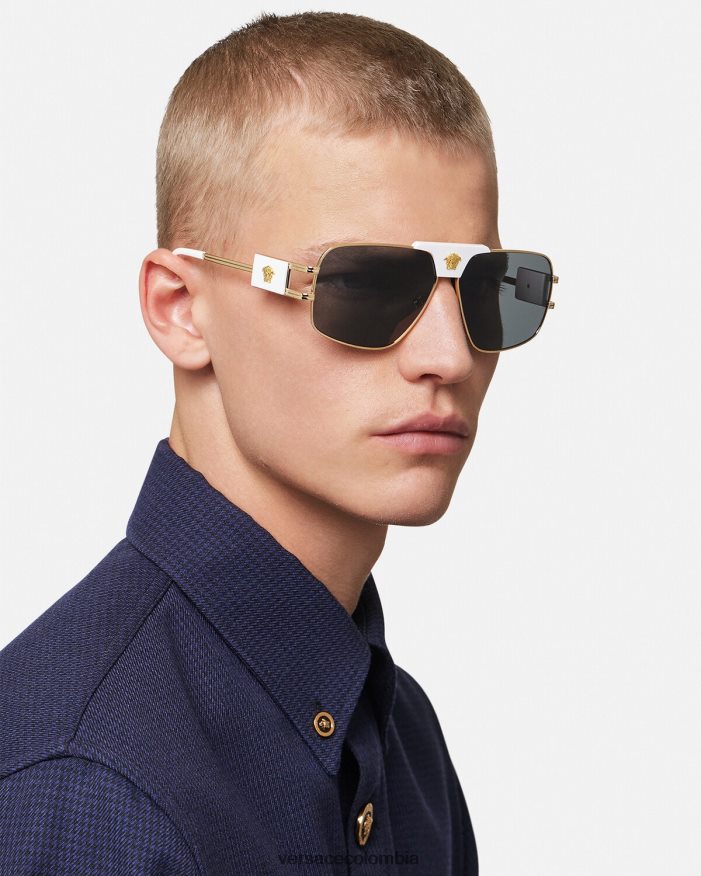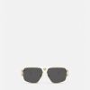 Gafas de sol geométricas inspiradas en aviadores con monturas de metal, lentes de color oscuro y herrajes de medusa.