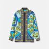 Confeccionada en sarga de seda con un corte holgado y fluido, esta camisa sin mangas tiene cierre frontal con botones, cuello con muescas y el estampado le maschere, una referencia clásica al teatro y la ópera en colores gráficos pop.