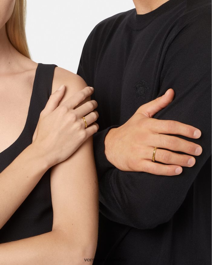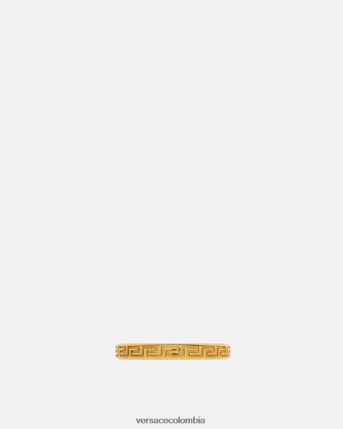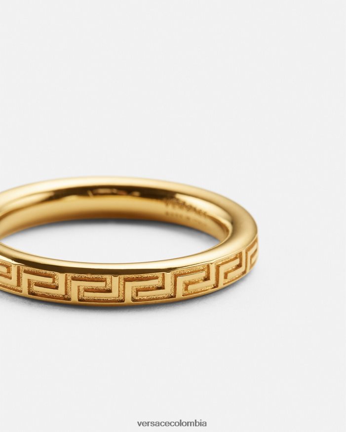 Anillo en tono dorado grabado con llaves griegas y logotipo en la banda interior.
