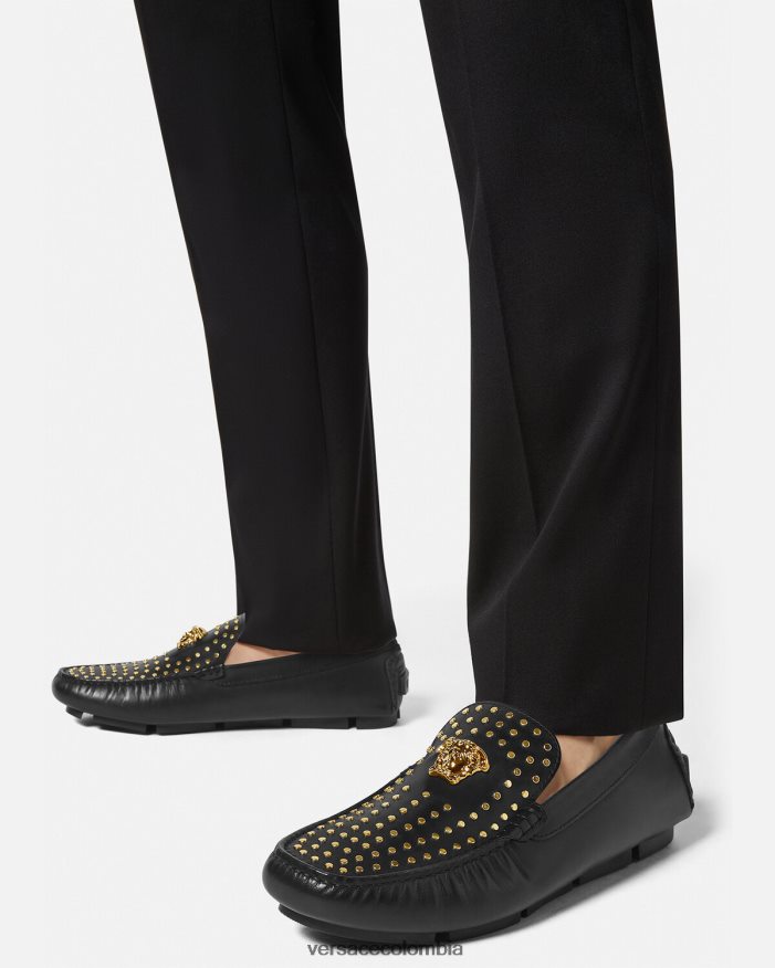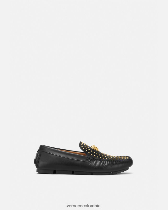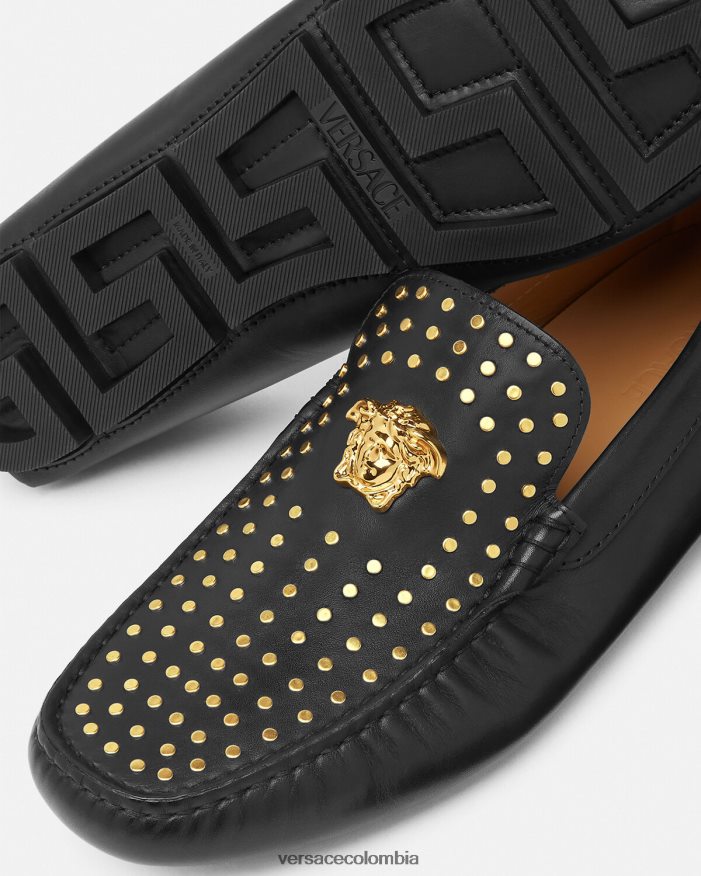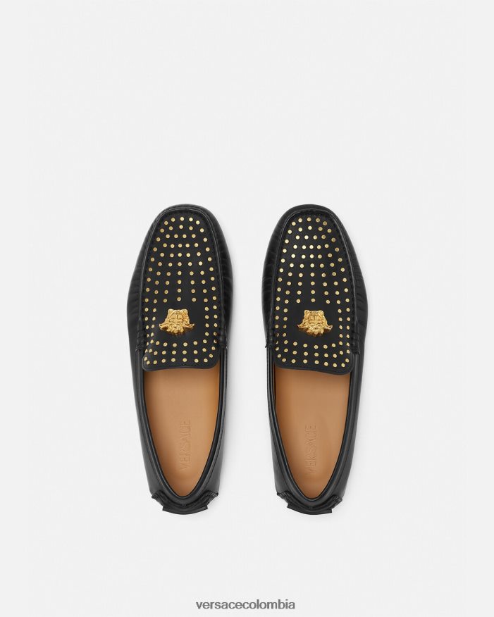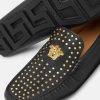Estos mocasines de cuero, un estilo de zapato de conducción sin cordones, están realzados por un adorno tridimensional de la Medusa en la parte superior y cuentan con un logotipo de goma en el talón. El par tiene una suela de goma con estampado de greca.