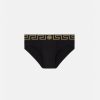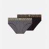 un conjunto de 2 calzoncillos de algodón con motivos de greca y medusa central en la cinturilla elástica.