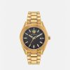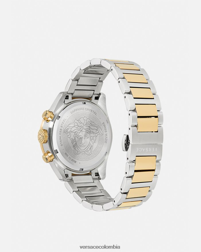 - caja: acero inoxidable y caja ip champagne; anillo superior negro con indicador de minutos y logotipo de versace