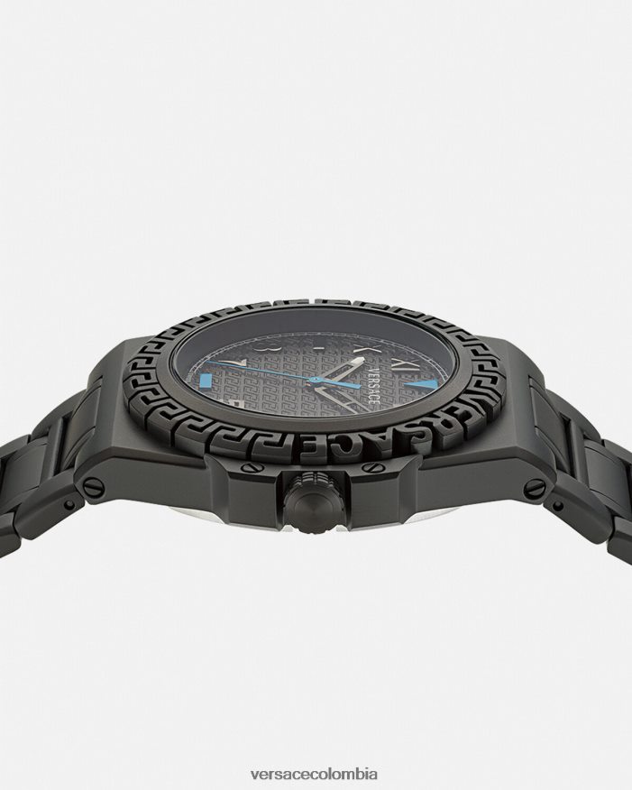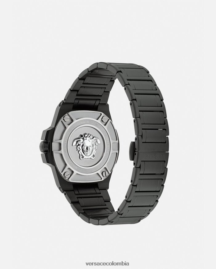 - Caja: redonda de IP negra de 44 mm con diseño de Greca y logotipo de Versace en el anillo