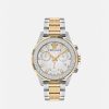 un reloj masculino mate equipado con movimiento cronógrafo y una esfera de tres contadores. el anillo está detallado con un patrón de greca grabado y letras Versace por todas partes, mientras que la esfera presenta una ventana de fecha ubicada a las tres en punto y un motivo de greca tonal en toda la superficie. La banda de metal está rematada con un cierre de mariposa y pulsadores.