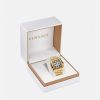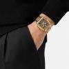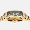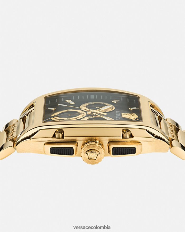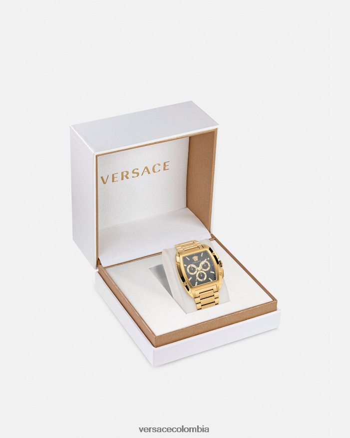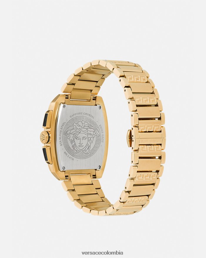 un reloj deportivo con caja tipo tonel: una forma intermedia de cuerpo redondo y rectangular. El reloj alberga un movimiento cronógrafo con 3 contadores y está rematado con una correa de metal. Todos los relojes Versace están garantizados por la marca “fabricación suiza”.