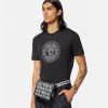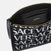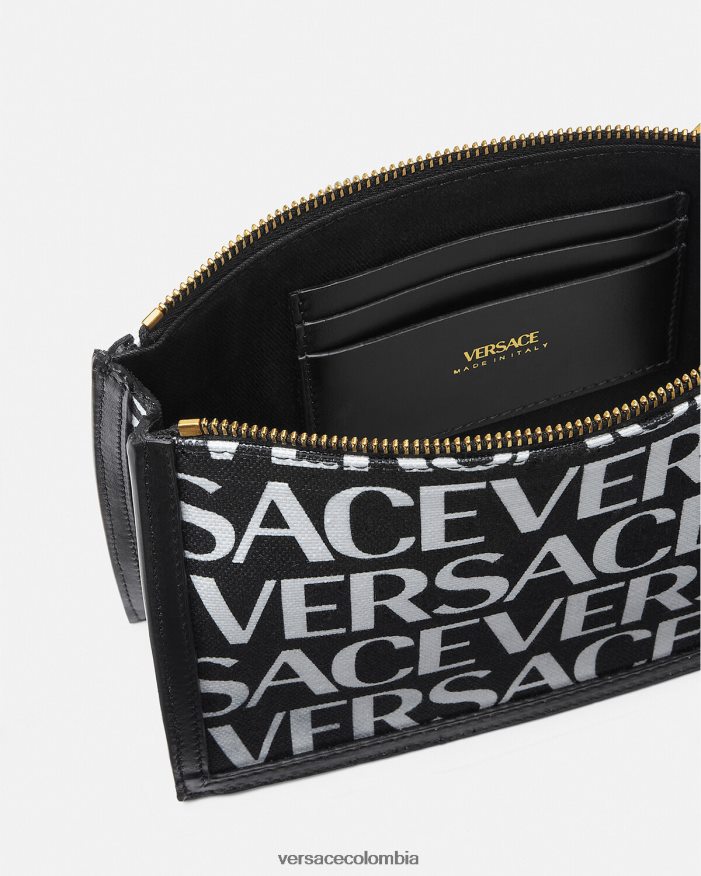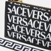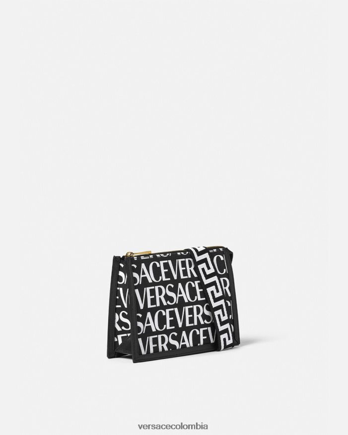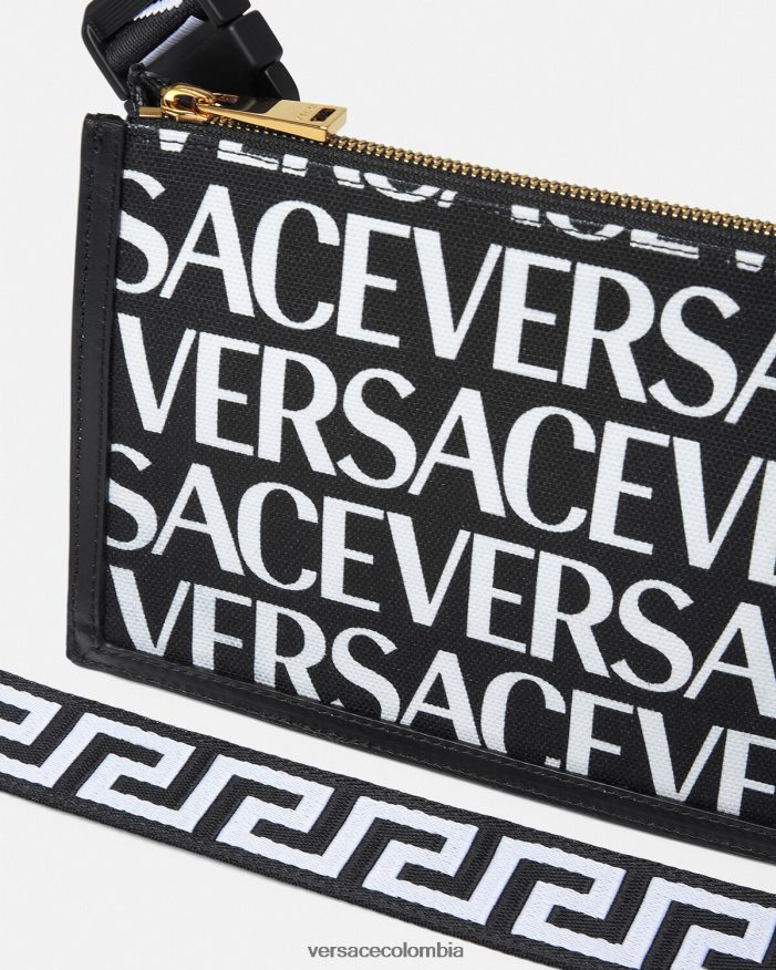 una riñonera compacta confeccionada en lona con el logo de versace estampado por toda la prenda. Este modelo versátil se puede llevar cruzado gracias a la correa ajustable de greca en jacquard y se completa con tres ranuras interiores para tarjetas.