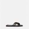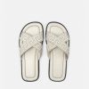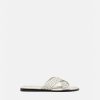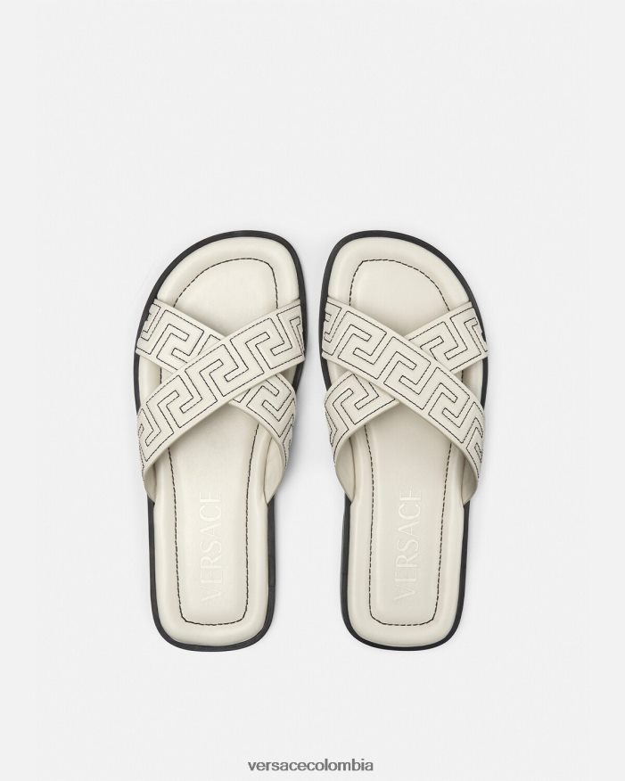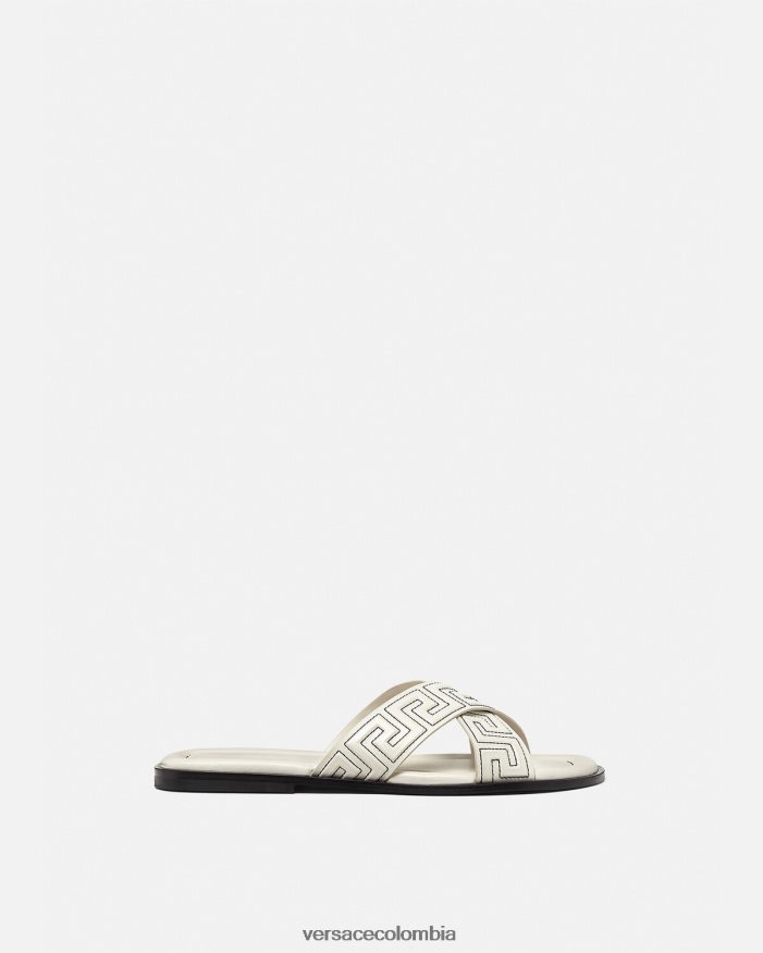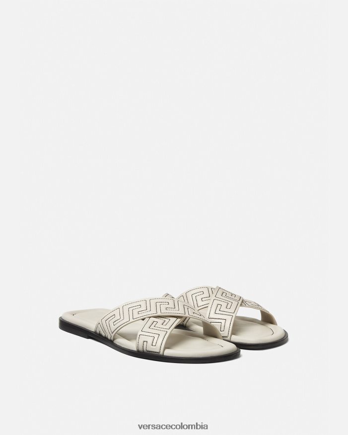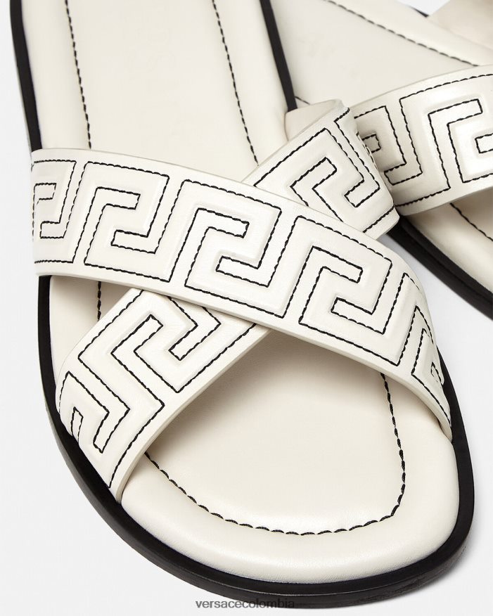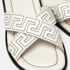 Estas sandalias con punta abierta están confeccionadas en cuero con un patrón de greca cosido en las tiras.
