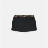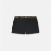 Estos shorts de baño, una versión atlética de un estilo característico, presentan la greca con un motivo central de medusa en la cinturilla elástica.