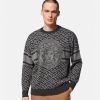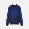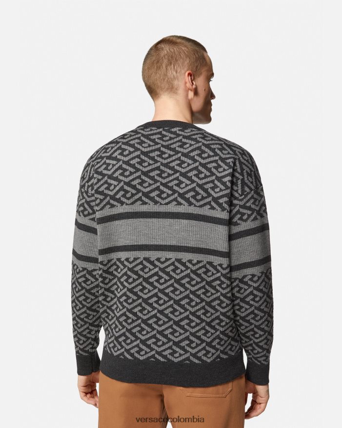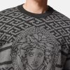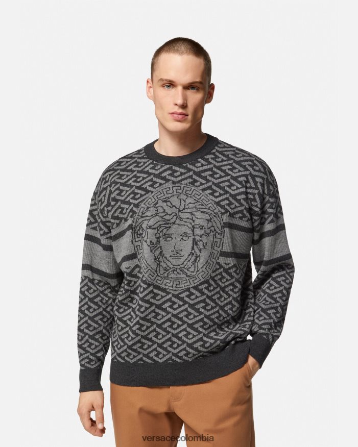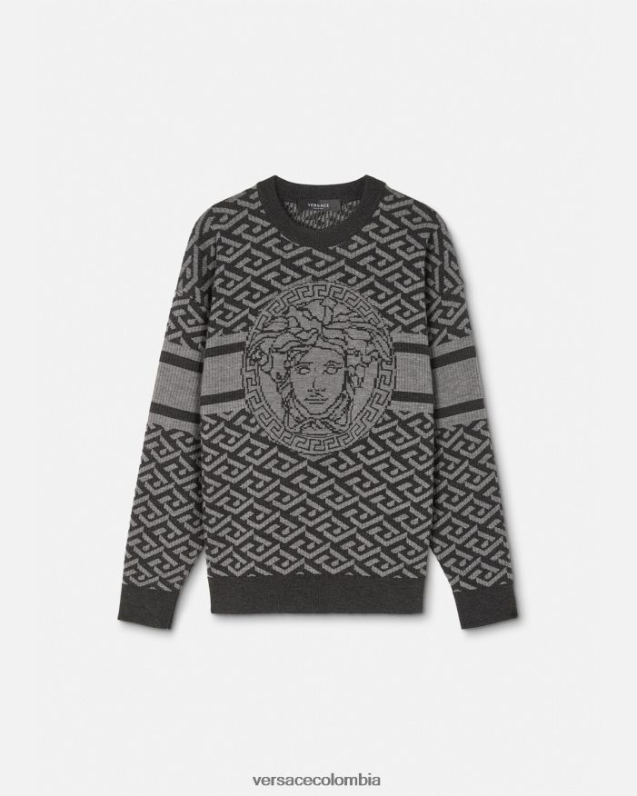 Este suéter de cuello redondo, tejido en jacquard de lana, presenta un motivo de La Greca y Medusa en dos tonos, completo con ribetes acanalados.