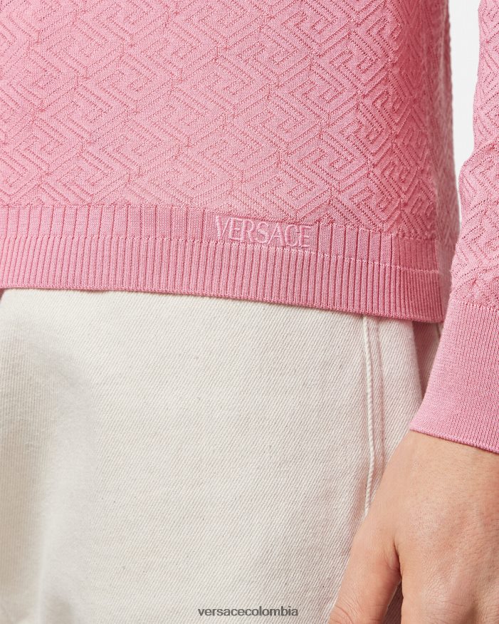 Este suéter de manga larga, confeccionado con una mezcla semitransparente de seda y algodón, presenta un estampado de La Greca tonal en toda su extensión y está rematado con ribetes acanalados.