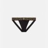 Tanga de algodón elástico con motivo de medusa central y greca en la cinturilla elástica.