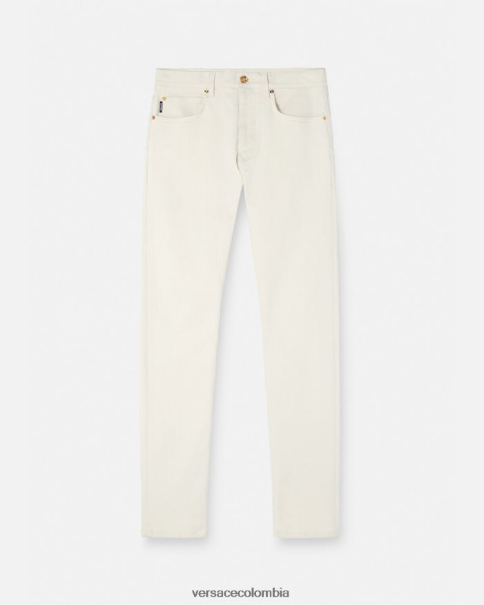 Estos jeans ajustados, confeccionados en denim de algodón elástico, presentan un diseño de cinco bolsillos con una placa de medusa tridimensional en la parte posterior.