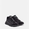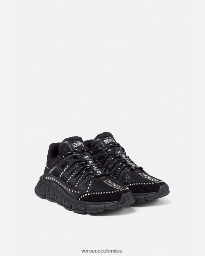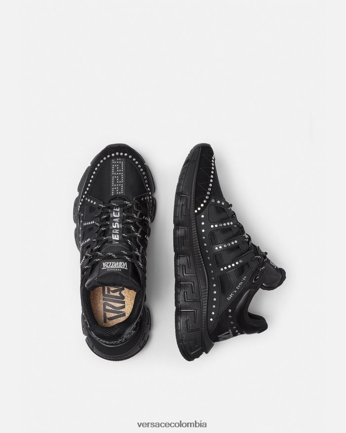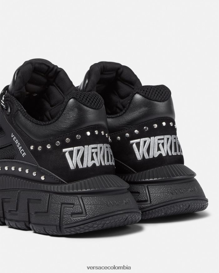 Las zapatillas Trigreca aportan innovación a la estética en constante evolución de la marca. Con un diseño tonal con detalles de tachuelas, las ejecuciones tridimensionales de greca en las suelas ofrecen un aterrizaje impactante con el “sistema de amortiguación greca”. En un sutil guiño a la ciudad natal de Versace, la parte superior tiene una discreta impresión de las coordenadas de Milán.