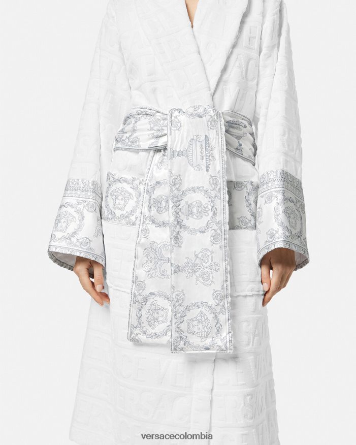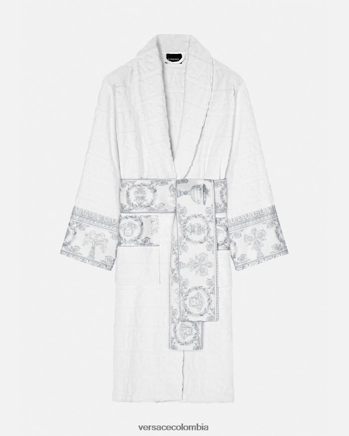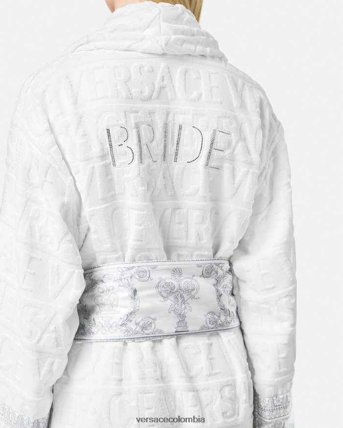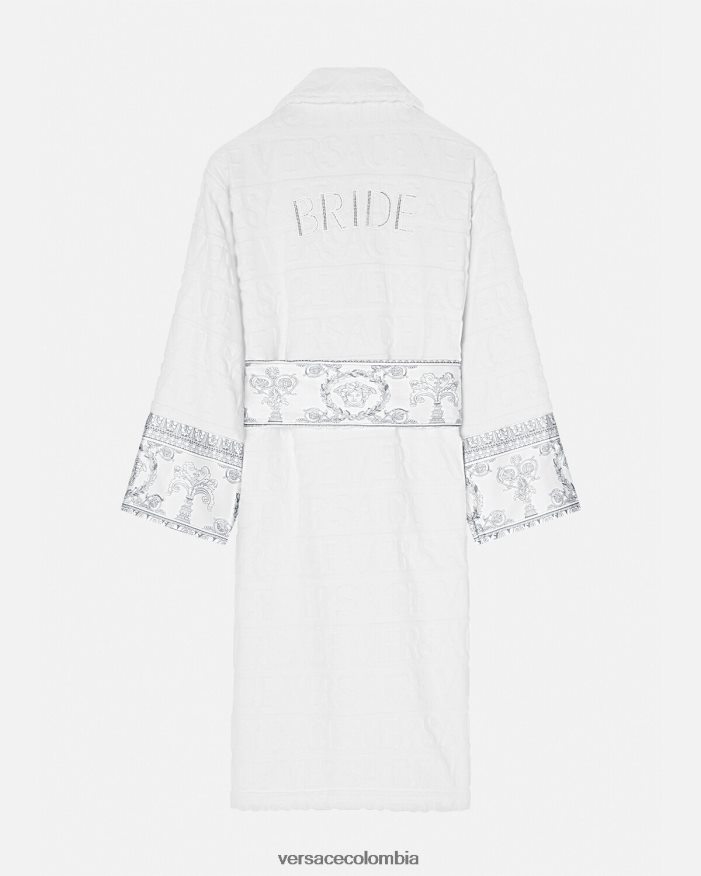 Esta bata de baño larga de algodón de rizo presenta un estampado integral de jacquard tonal de Versace. El albornoz de novia adornado con cristales se puede combinar con el albornoz de novio a juego para una ocasión especial de boda. El estilo loungewear se detalla con mangas con estampado barroco en el mismo tono y un cinturón anudado.