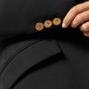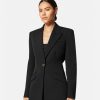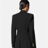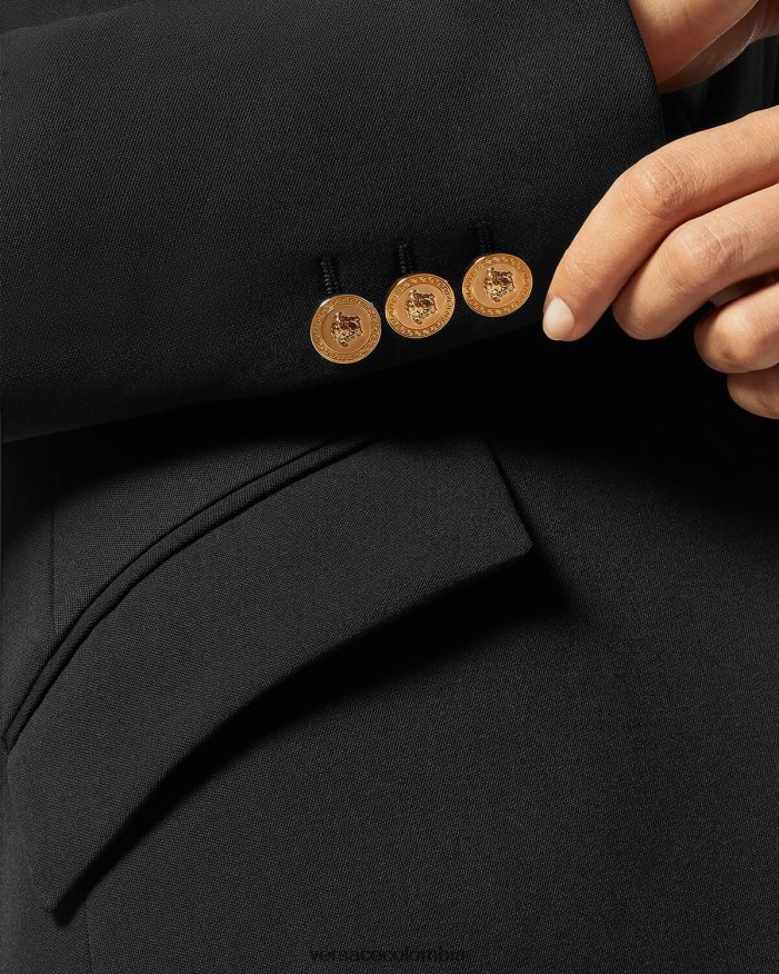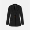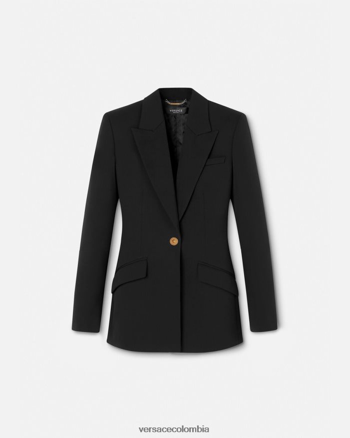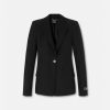 Hombros afilados y entallados aparecen en este blazer de botonadura sencilla con bolsillos laterales angulares, solapa de muesca y un solo botón Medusa.