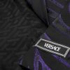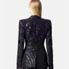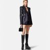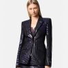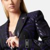 un blazer de botonadura sencilla con estampado de cebra, hombros muy pronunciados de Versace, solapas de pico y cierre de un solo botón.
