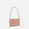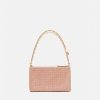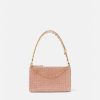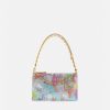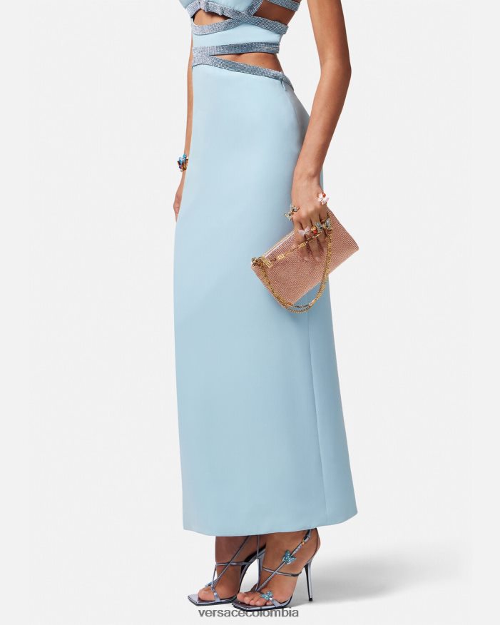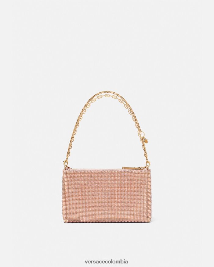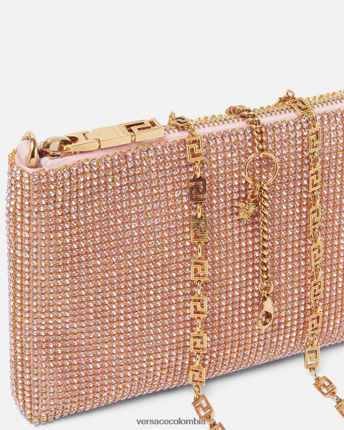 Este bolso de mano de malla metálica está adornado con cristales, un forro de satén y cuenta con un asa de greca de cadena y dos correas de cadena desmontables. dua lipa x versace es una cápsula de estilos diseñados en colaboración con dua lipa y presentados en la pasarela de cannes.