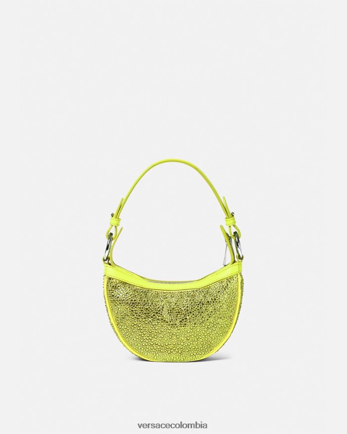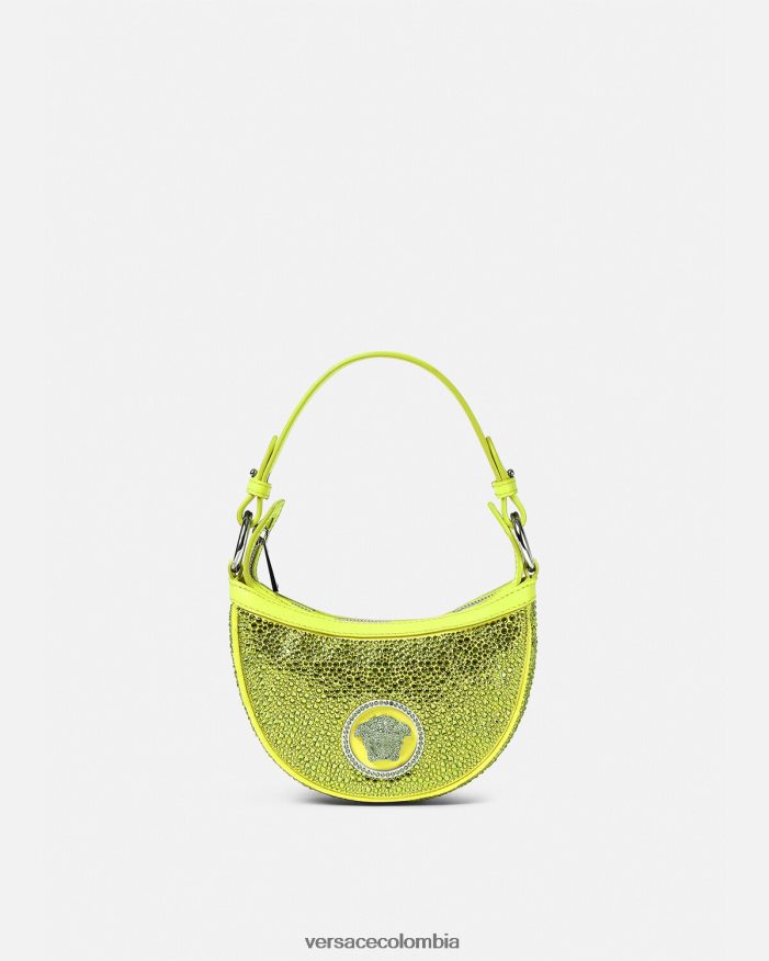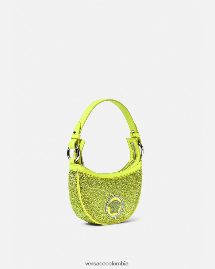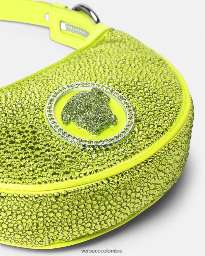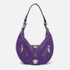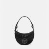 Una edición mini de la silueta hobo, el bolso de hombro repetido está adornado con cristales y ribetes de cuero. Un emblema de la Medusa adornado con cristales tonales acentúa el accesorio.
