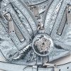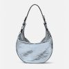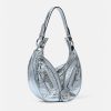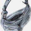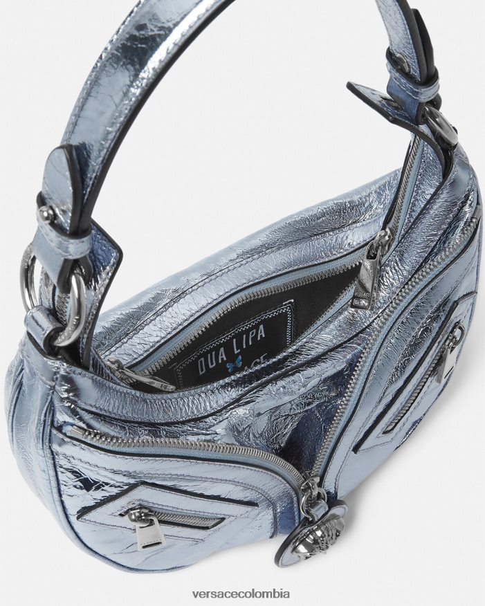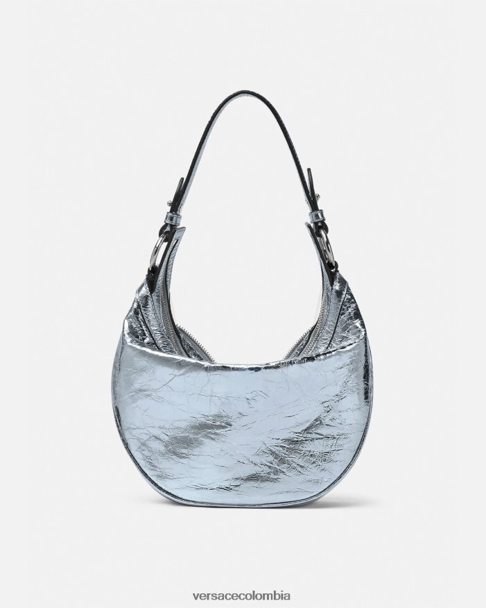 El bolso de hombro repetido, una reedición de una silueta hobo de archivo, está confeccionado en cuero metalizado con efecto craquelado. De inspiración motera, un tirador con dije de medusa y cremalleras diagonales añaden una actitud grunge con un toque versace.