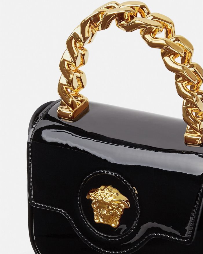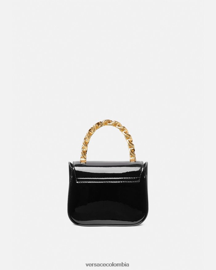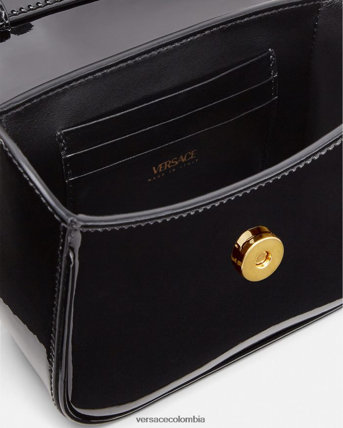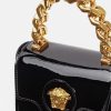 Elaborado en Italia con cuero brillante, este diseño presenta un asa superior de cadena rígida. Está adornado con una medusa central en tono dorado y cuenta con una correa para el hombro ajustable.