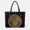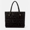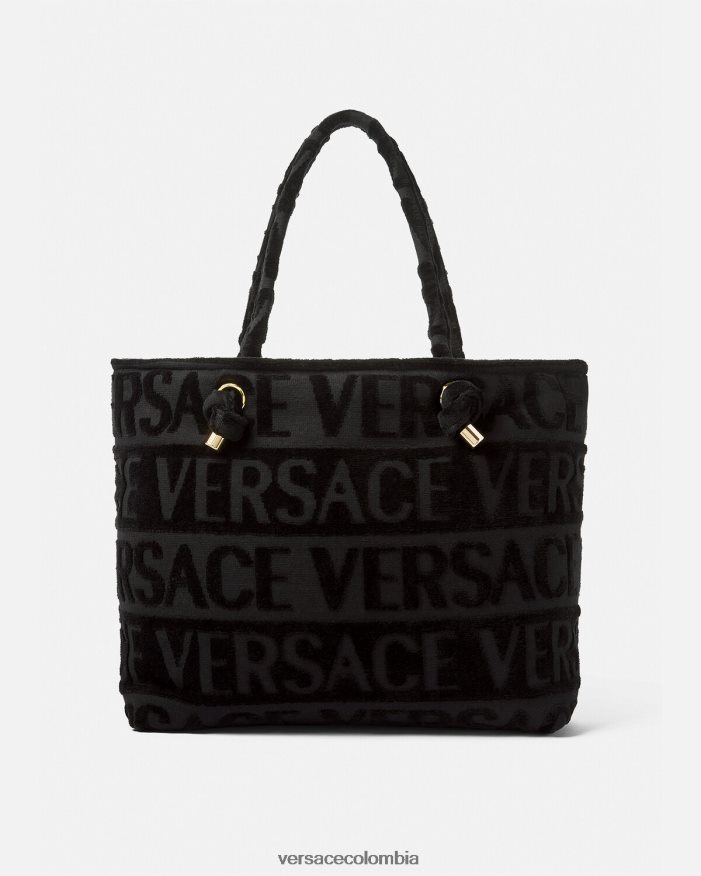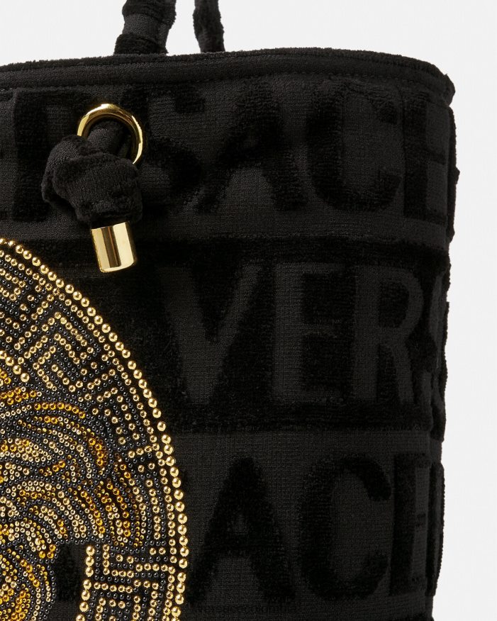 Confeccionado en tejido de toalla, este bolso tote de Versace presenta un logotipo tonal y una medusa adornada con cristales, ideal para guardar artículos esenciales para la playa o la piscina.