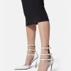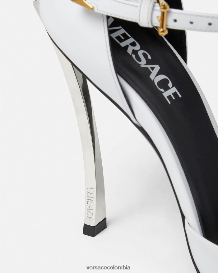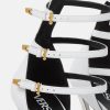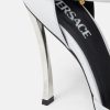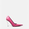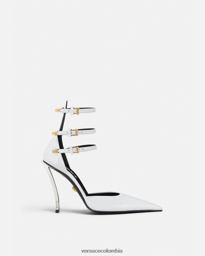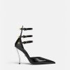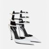 Caracterizados por tacones de aguja altos y curvos, estos zapatos de tacón de cuero cuentan con puntera puntiaguda y correas con doble hebilla en la parte delantera. están acentuados por herrajes en forma de V.