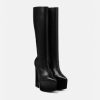 Estas llamativas botas de cuero puntiagudas hasta la rodilla de Versace se definen por un tacón de plataforma con muescas en forma de onda.
