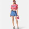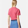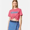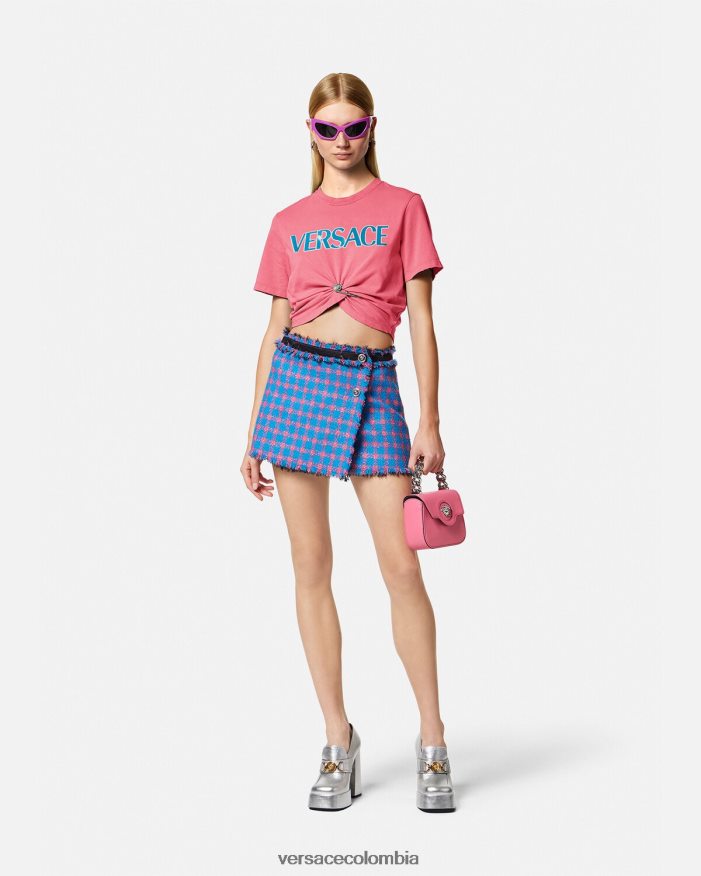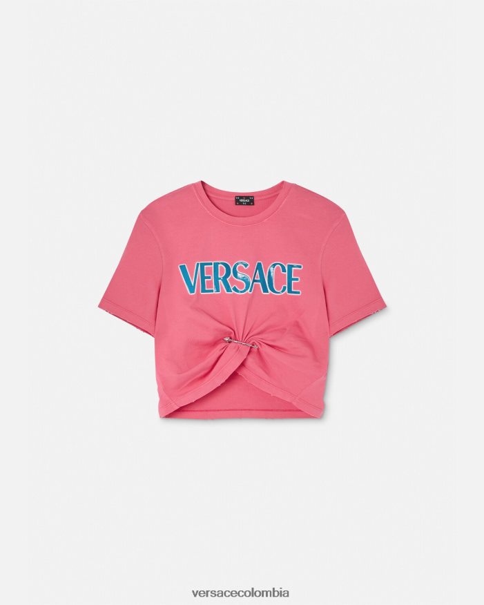 Esta camiseta corta de manga corta presenta el logo de Versace en el pecho con un acabado de goma. el estilo tiene un dobladillo fruncido y un llamativo imperdible.
