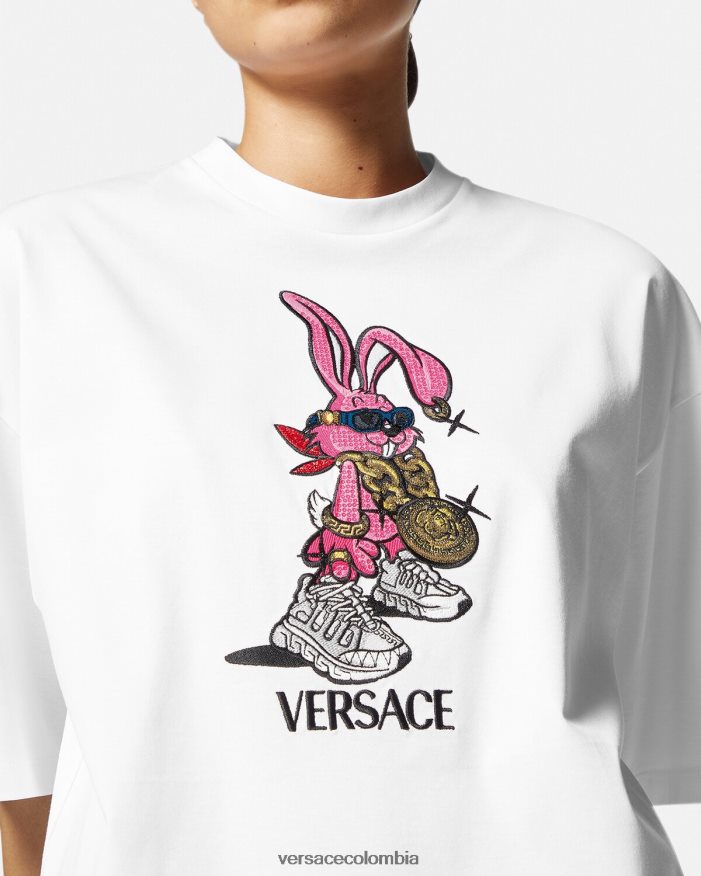 Celebrando el año del conejo, esta camiseta extragrande de algodón presenta un conejito biggie bordado y con lentejuelas que lleva gafas de sol medusa biggie, una cadena de medusa y trigrecas.