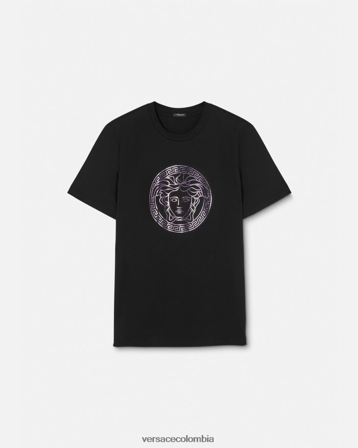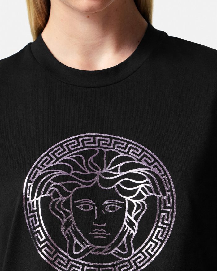 Esta camiseta de manga corta de punto de algodón tiene un ajuste relajado y presenta un motivo de medusa con acabado metálico en la parte delantera.