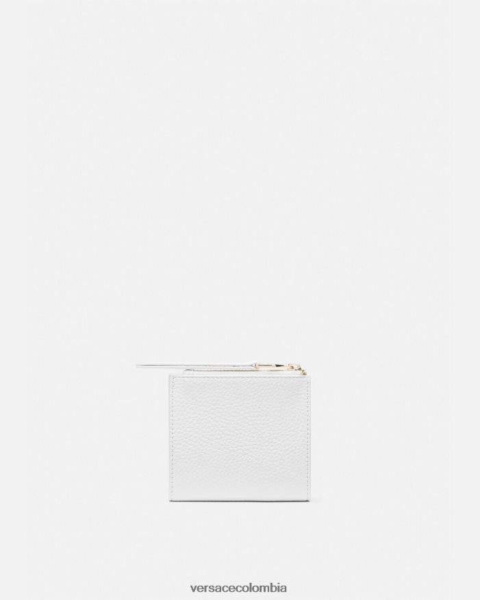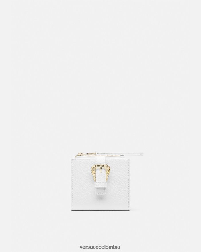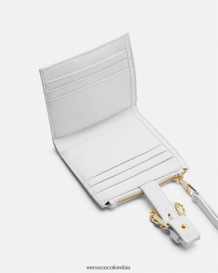 una cartera compacta con múltiples ranuras para tarjetas en el interior y una hebilla barroca en la parte delantera.