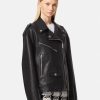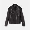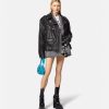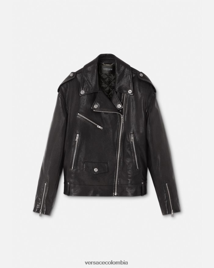 Confeccionada en cuero granulado, esta chaqueta motera con cremallera tiene un acabado revestido que ofrece un aspecto brillante al reflejar la luz. Los detalles metálicos de Medusa bruñidos acentúan la pieza, mientras que un forro acolchado proporciona calidez.
