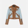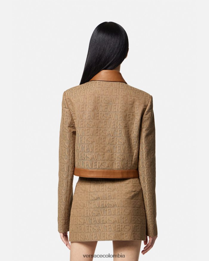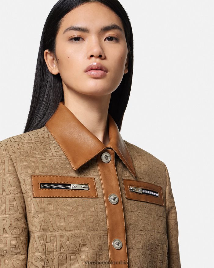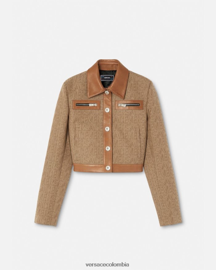 Esta chaqueta corta de lona y cuero presenta el estampado integral de Versace y detalles metálicos de Medusa.