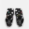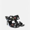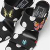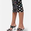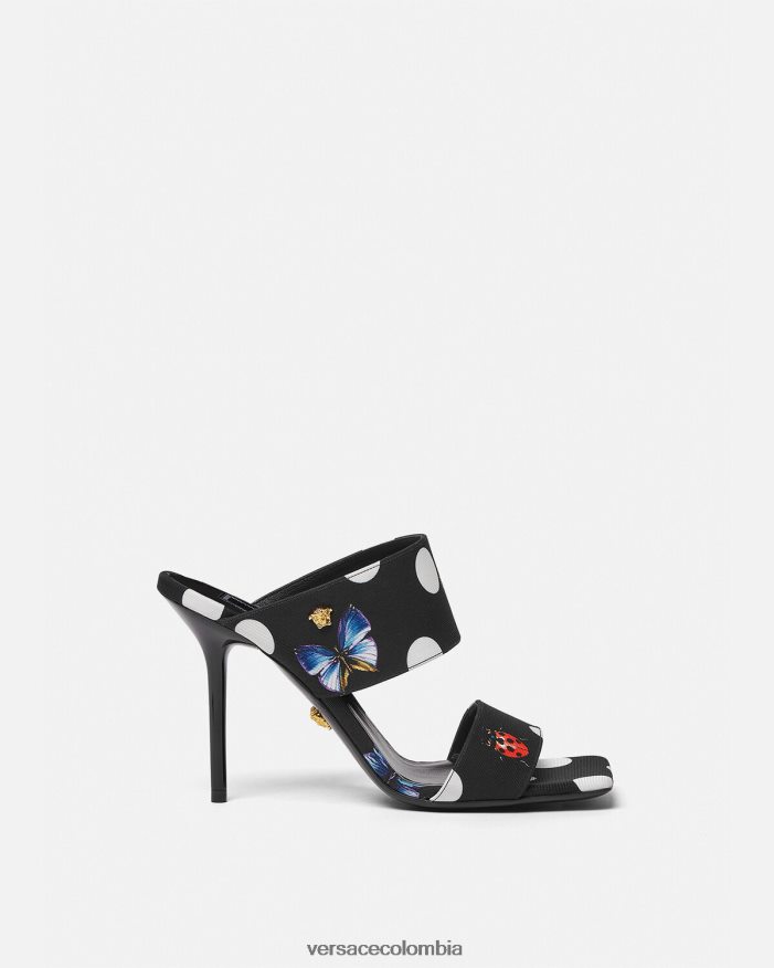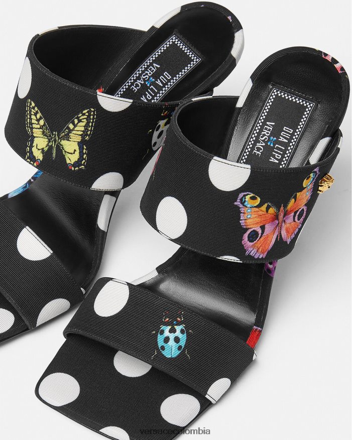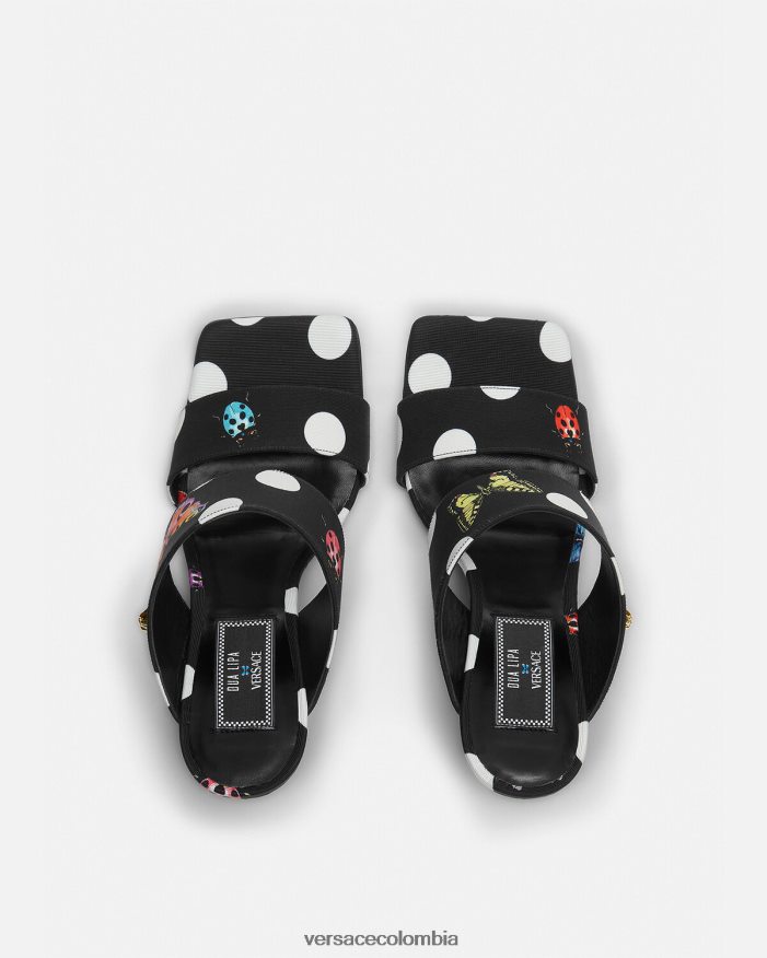 Dua Lipa es la diseñadora invitada de la colección cápsula Dua Lipa x Versace, realizada en colaboración con Donatella Versace. Estas mules de tacón de aguja alto cuentan con un estampado de mariposas y mariquitas de lona con lunares, parte superior con doble tira y herrajes de medusa.